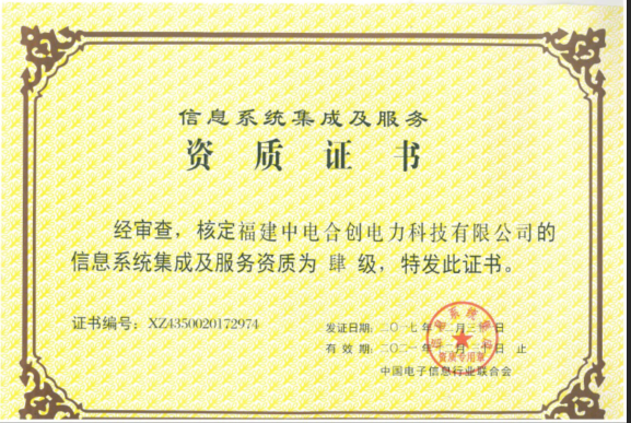 2017年12月21日,福建中电合创电力科技有限公司顺利通过中国电子信息行业联合会信息系统集成资质工作委员会审定,正式取得了信息系统集成及服务肆级资质证书。