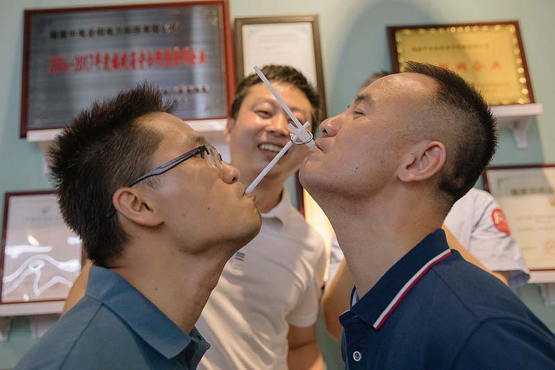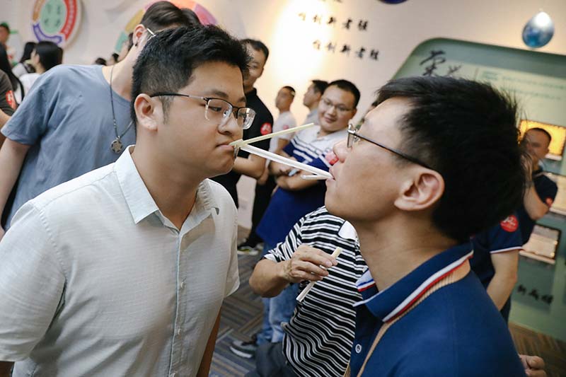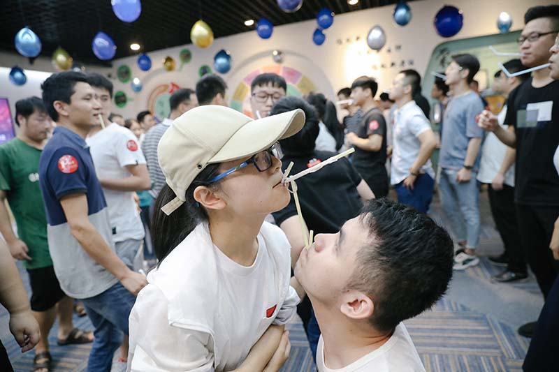 吸管传物:8个队伍用嘴叼着吸管,通过吸管传递钥匙扣,最先传递成功的队伍获胜。在一次次的失败中,大家也明