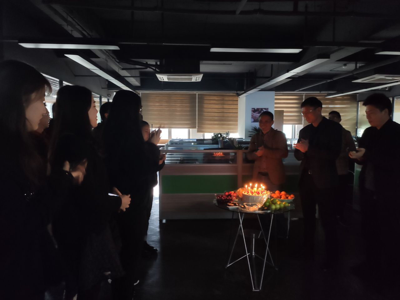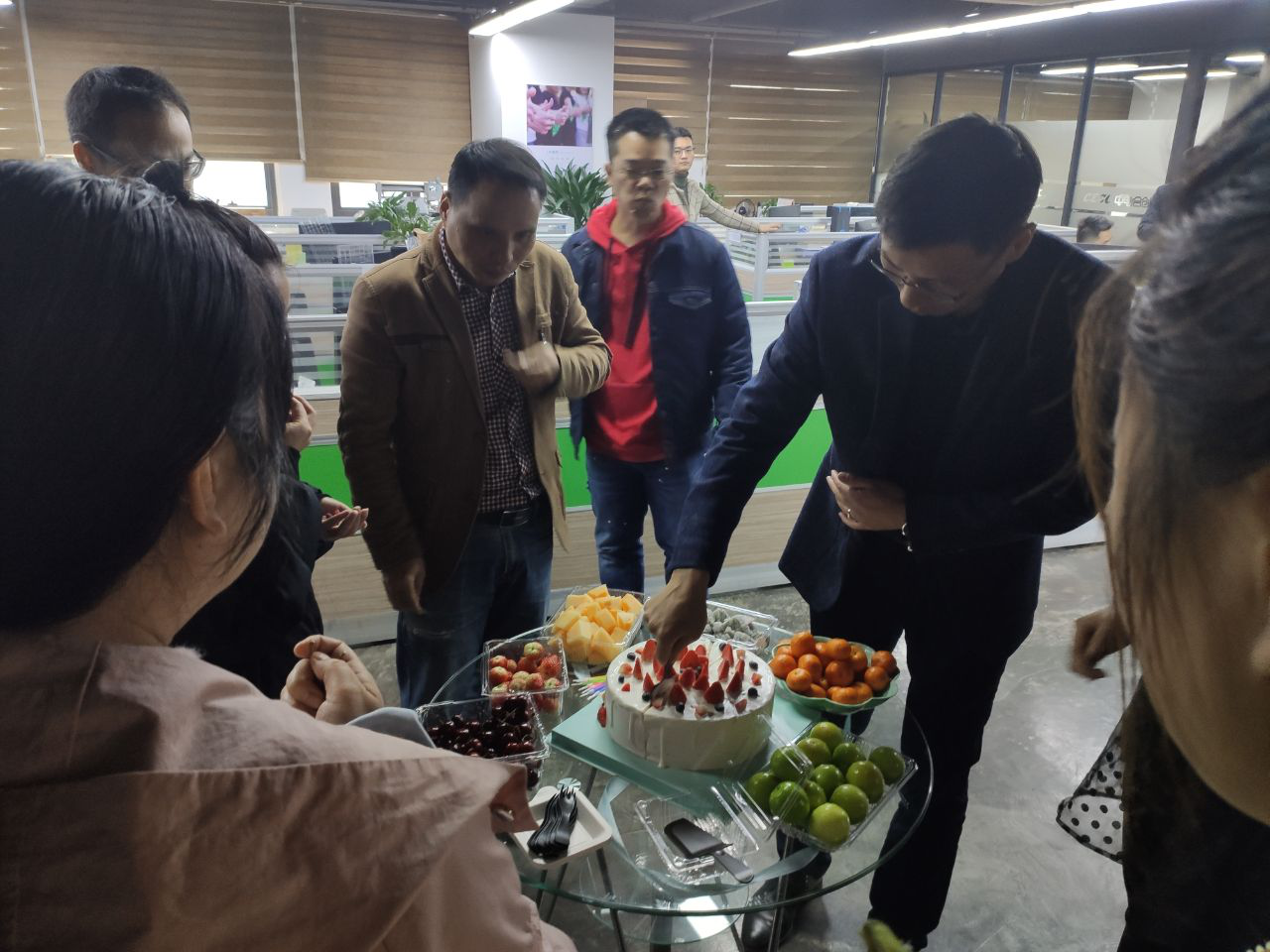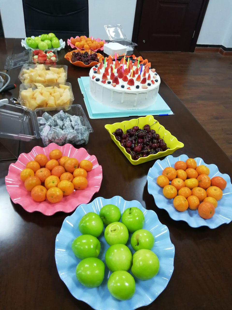 2020年1月11日,在台江和马尾两个办公室,摆好了综合部小姐姐精心准备的水果,给大家忙碌的工作中增添了几分色彩。都说甜品使人快乐,蛋糕更是少不了的,希望甜蜜的蛋糕可以给大家带来美好的心情,点上蜡烛,给大家一个惊艳的祝福。